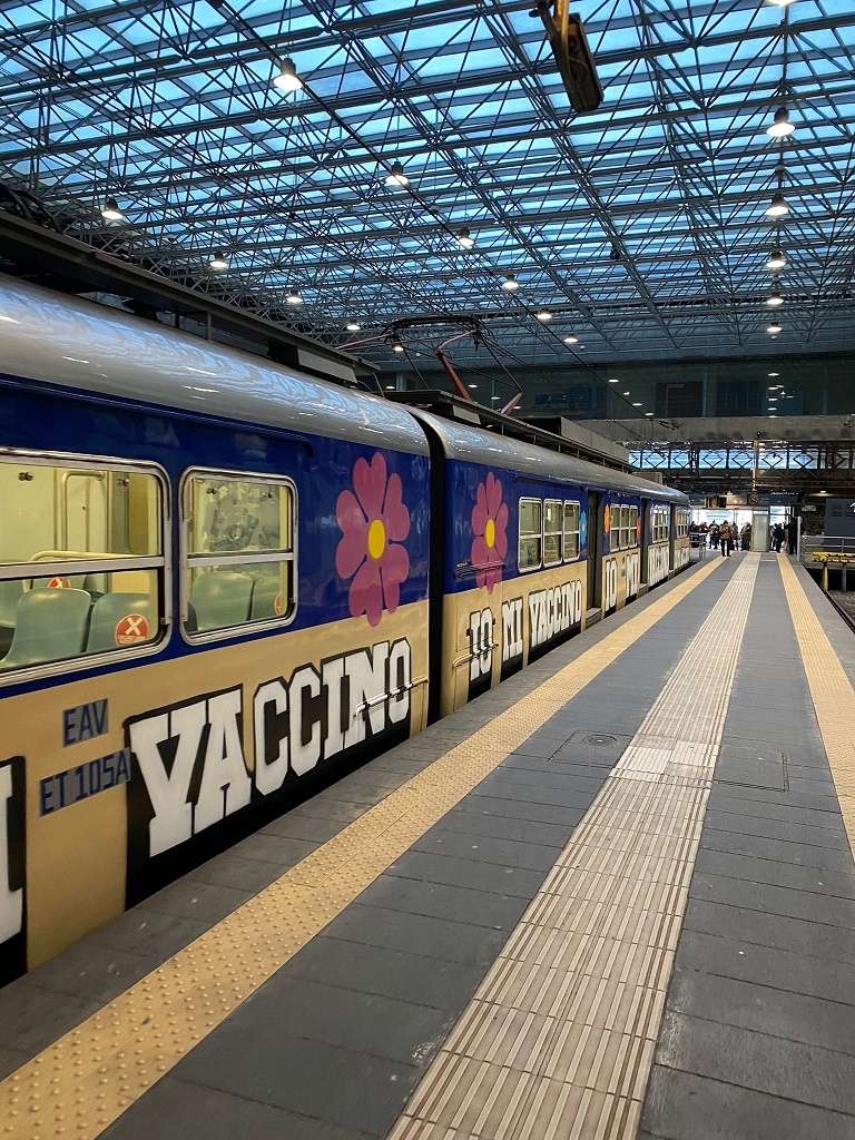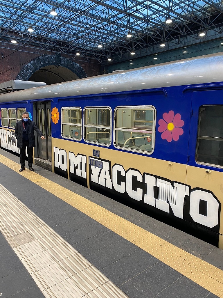 Da oggi (18 gennaio) circola sulle linee flegree un treno con la scritta "IO MI VACCINO". Si tratta di un treno fabbricato nel 1960 che era stato ricoperto di scritte di writers e che, ad opera di un gruppo di volontari, è stato ridipinto per sensibilizzare tutti al tema della prevenzione e della necessità di una vaccinazione di massa. Gli stessi artisti che hanno ridipinto la stazione di Bagnoli, guidati da Luca Danza, ci hanno regalato questa iniziativa.