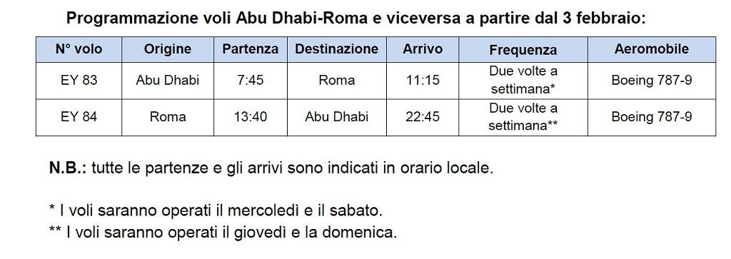 Etihad Airways, la compagnia aerea nazionale degli Emirati Arabi Uniti, riapre i voli per Roma dal 3 febbraio, offrendo maggiori collegamenti tra Italia ed Emirati Arabi Uniti. La rotta sarà operata due volte a settimana con la flotta di Boeing 787 di Etihad, portando a nove il numero di voli passeggeri settimanali per Milano Malpensa e Roma Fiumicino.