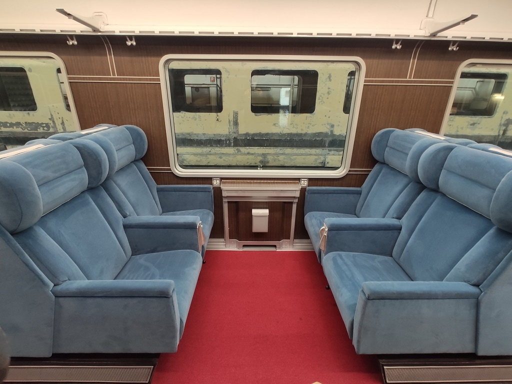Dopo il ripristino dei lamierati e la preparazione del fondo, si è proceduto alla verniciatura con il ripristino dello schema originale di coloritura FS "Bandiera". Successivamente si è provveduto al rimontaggio dei vetri, i cui cristalli, insieme alle guarnizioni, sono stati completamente sostituiti. Le maestranze hanno proceduto al rimontaggio di tutta la componentistica attraverso una ricostruzione filologica che ha restituito alla vettura il suo originale aspetto: sedili, pannelli, tavolini, targhette e pittogrammi interni.