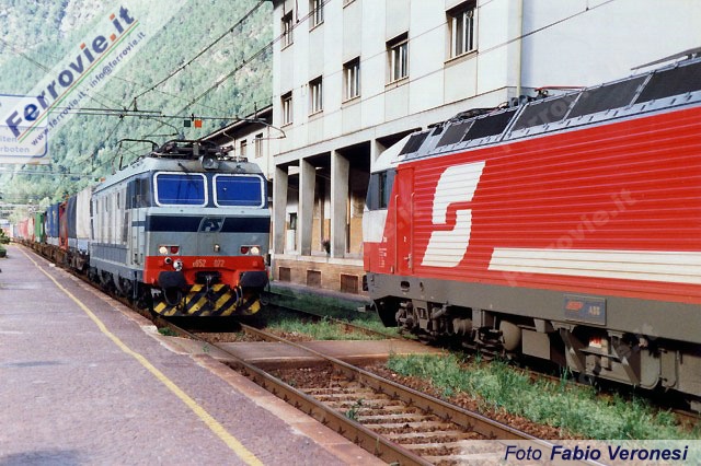 Un convoglio intermodale diretto verso sud transita accanto al D482 Spittal - Innsbruck, affidato alla ÖBB 1822, una presenza abituale nella stazione di Fortezza in testa ai "korridorzüge", i treni corridoio. (Foto Fabio Veronesi, 17 settembre 1998)