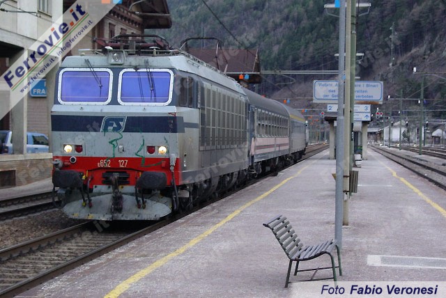 La potente E.652.127 traina agilmente la breve composizione dell'Espresso 13226 San Candido - Bruxelles, iniziando l'ascesa verso il passo del Brennero. (Foto Fabio Veronesi, 19 marzo 2005)