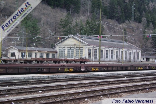 L'ex deposito locomotive di Fortezza - Franzensfeste oggi inutilizzato. In primo piano due composizioni di carri ultrabassi utilizzati in passato per la RoLa gestita da Bertani Servizi Ferroviari ed ora temporaneamente ricoverati a Fortezza. (Foto Fabio Veronesi, 19 marzo 2005)
