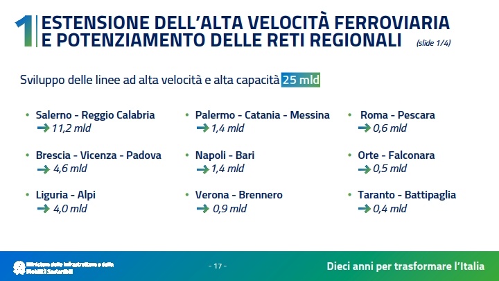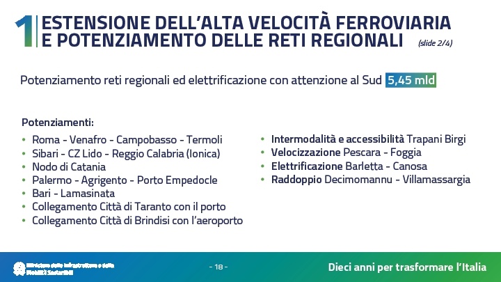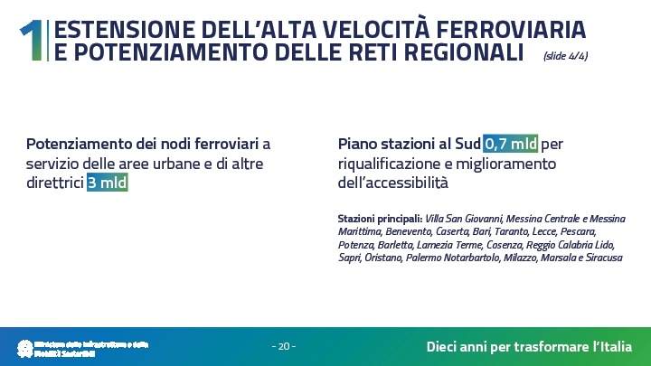 Estensione dell'Alta Velocità ferroviaria e potenziamento delle reti regionali - Per lo sviluppo delle linee ferroviarie ad Alta Velocità/Alta Capacità sono previsti investimenti per 25 miliardi, mentre 5,45 miliardi sono destinati al potenziamento delle reti regionali e l'elettrificazione, con una particolare attenzione al Mezzogiorno, e al miglioramento dei collegamenti ferroviari con porti e aeroporti. Per il programma di potenziamento dei nodi ferroviari nelle aree urbane sono previsti circa 3 miliardi, mentre 700 milioni serviranno per la riqualificazione di 30 stazioni strategiche dal punto di vista trasportistico e turistico.