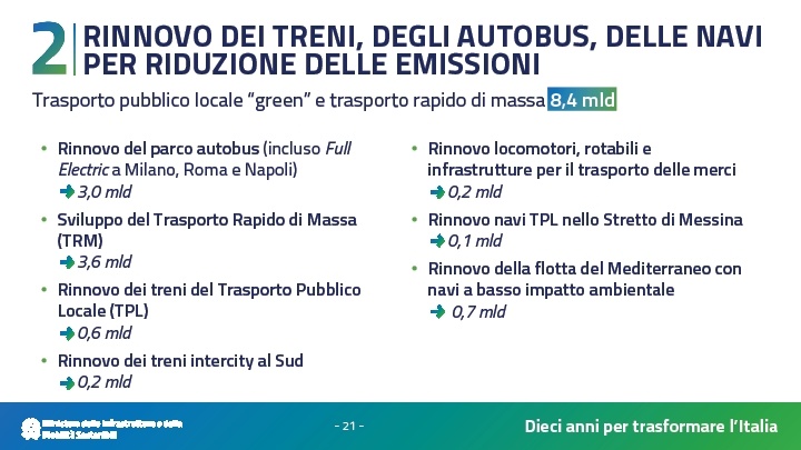 Rinnovo dei treni, degli autobus, delle navi per riduzione delle emissioni - Risorse pari a 8,4 miliardi sono destinate al trasporto locale 'green' e al trasporto rapido di massa. Rientrano in questo ambito il rinnovo del parco autobus (con l'acquisto di mezzi per rendere full electric le città di Milano, Roma, Napoli) e dei treni per il trasporto pubblico locale e degli Intercity al Sud, il rinnovo di materiale rotabile per il trasporto delle merci e l'acquisto di nuove navi 'ecologiche' anche da destinare ad un collegamento più veloce e sostenibile nello Stretto di Messina.