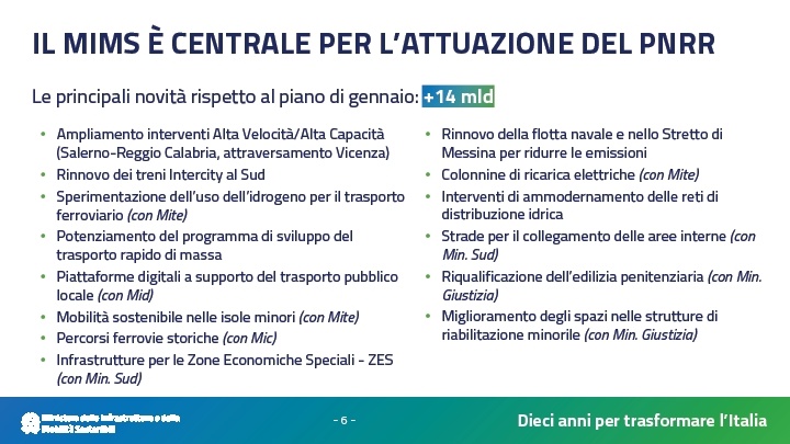Ammontano a complessivi 62 miliardi di euro gli interventi sulle infrastrutture, sulla mobilità e sulla logistica sostenibili contenuti nel Piano Nazionale di Ripresa e Resilienza (PNRR) approvato dal Consiglio dei Ministri. Una cifra che fa emergere il ruolo centrale del Ministero delle Infrastrutture e della Mobilità Sostenibili (MIMS) nell'attuazione di progetti determinanti per il rilancio del Paese, basato sulla sostenibilità economica, sociale e ambientale. Rispetto alle risorse previste a legislazione vigente per gli investimenti di competenza del MIMS, il PNRR aggiunge 47 miliardi di euro. Inoltre, nella versione definitiva del Piano le risorse per infrastrutture, mobilità e logistica sono aumentate di 14 miliardi rispetto alla bozza approvata dal precedente esecutivo il 12 gennaio scorso.
