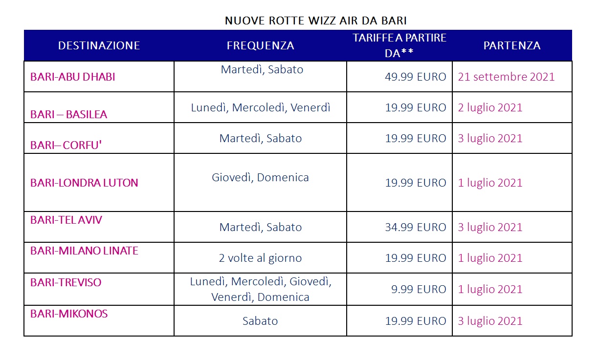 Wizz Air, la compagnia aerea in più rapida crescita in Europa, annuncia oggi (6 maggio) l'assegnazione di un aeromobile Airbus A321 alla sua base di Bari e il raddoppio della sua capacità presso l'aeroporto. Dal 1° luglio partiranno le 8 nuove rotte dal capoluogo pugliese. Collegamenti internazionali come Abu Dhabi, Basilea, Corfù, Londra Luton, Mykonos, Tel Aviv e nazionali come Milano Linate e Treviso arricchiranno il network della compagnia da Aeroporti di Puglia, offrendo ai passeggeri una scelta completa di destinazioni leisure, city break e destinazioni di interesse culturale.