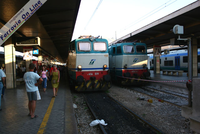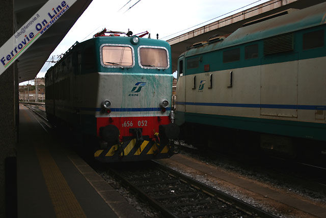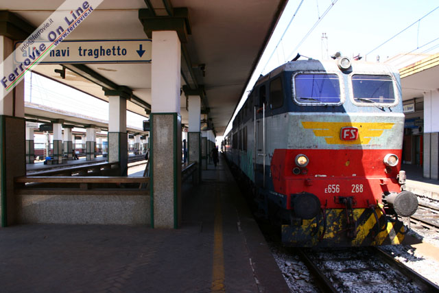 Sul binario attiguo di Messina Centrale è pronta la E.656.099 con un altro D.145, che ripeteranno l'operazione per portare in stazione la sezione del "Peloritano" diretta a Siracusa, classificata IC 727.