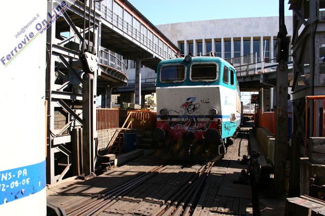 Pochi minuti e siamo a Messina Marittima con la E.656.019 che si porta fin sulla nave, spinta da una D.145, per agganciare la più lunga sezione di Palermo, che arriva al limite della celata di prua. La presenza del "Caimano" già in manovra di sbarco non è una novità: si è scelto di accelerare le operazioni agganciando da subito il locomotore titolare della sua sezione. Inoltre sarebbe previsto l'alzamento del pantografo non appena il locomotore è sotto la linea di contatto per alimentare i servizi di bordo, tra cui l'indispensabile aria condizionata nel caso di vetture con vetri bloccati come le nostre (vedi Approfondimenti del 21/09/2003). Ma oggi non è così e respireremo nuovamente aria fresca soltanto pochi minuti prima di lasciare Messina.