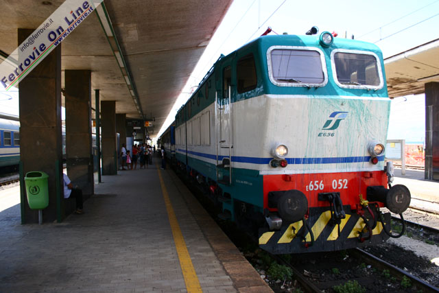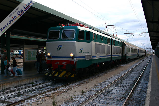 Dietro la E.656.052 fresca di revisione, due vetture tipo X di seconda classe (non ristrutturate, quindi senza aria condizionata) malamente imbrattate ed a seguire una Gran Comfort declassata a compartimenti, che ha visto tempi decisamente migliori: l'aspetto d'insieme è alquanto dimesso, manca la moquette nei corridoi come nei compartimenti e mancano anche le foderine ai poggiatesta...