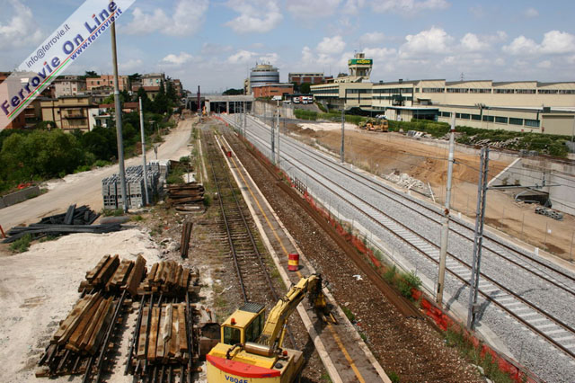 Pochi giorni dopo l'attivazione del raddoppio, sono cominciati i lavori di smantellamento del vecchio tracciato, su cui verrà posato il doppio binario per l'Alta Velocità. Nell'immagine la stazione di Roma Prenestina, dove alla data della fotografia era stato già rimosso il binario di corsa. (Foto David Campione, 9 luglio 2005)