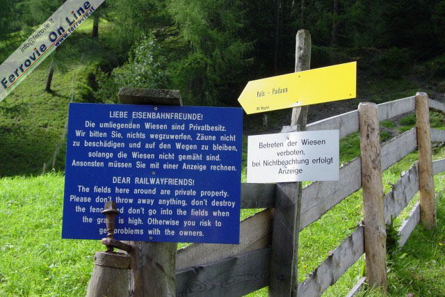 Un chiaro cartello ricorda agli "eisenbahnfreunde", ovvero gli appassionati di ferrovie, che ci si trova in una proprietà privata e che è vietato camminare sui prati quando l'erba è alta; probabilmente qualcuno in passato deve aver creato non pochi danni ed effettivamente la tentazione di andare "fuori percorso" è davvero tanta! Comunque, pur dovendo seguire il tragitto ai margini degli appezzamenti di terreno o lungo i solchi lasciati dai mezzi agricoli, è possibile raggiungere gli appostamenti migliori, da dove si ha un'ottima visuale sull'intero percorso della ferrovia nella valle.
