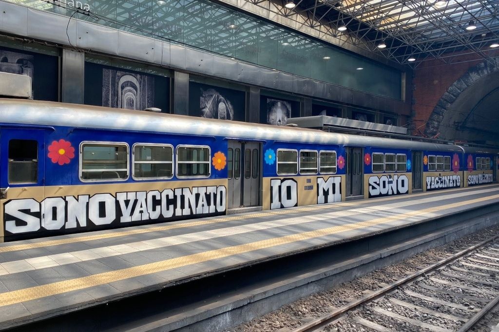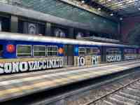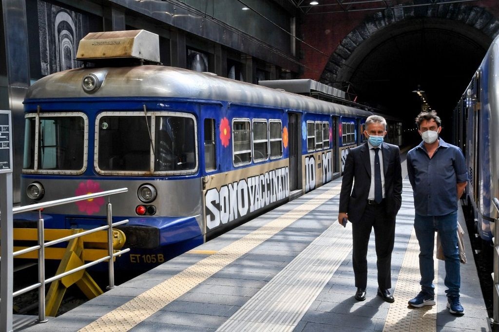 Poiché era stato vandalizzato da qualche balordo qualche giorno fa e poiché tutti i lavoratori di EAV sono stati vaccinati, è stato ripulito il treno "IO MI VACCINO" (vedi Brevi ferroviarie del 18/01/2021) e oggi 27 maggio, a Montesanto, ribattezzato in "IO MI SONO VACCINATO".