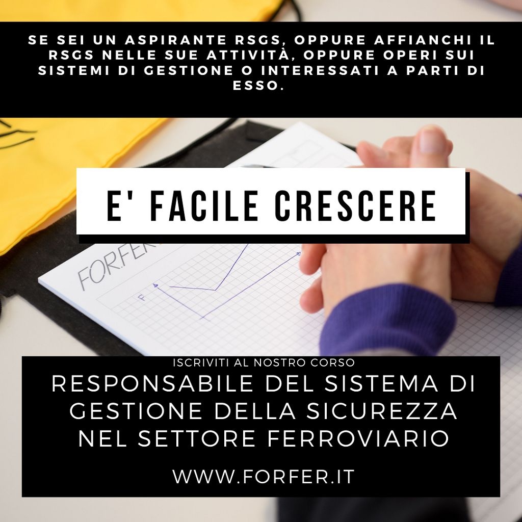 Un nuovo corso dedicato agli aspiranti RSGS, a coloro che affiancano il RSGS nelle sue attività e a coloro che operano sui Sistemi di Gestione o sono interessati a parti di essi, sarà disponibile dal 29 giugno 2021 nel programma di For.Fer, centro d'eccellenza per la formazione ferroviaria riconosciuto dall'ANSFISA per tutte le attività di sicurezza della circolazione ferroviaria.