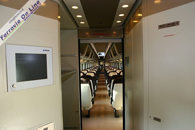 Per niente scoraggiato e con una buona dose di curiosità salgo sulla carrozza, ben identificabile dall'esterno grazie alla generosa dimensione dell'indicazione di classe, argento per la prima e rosso-arancio per la seconda, come dalla chiara etichetta apposta su ogni porta che indica il numero della carrozza. Anche all'interno la vettura è facilmente identificabile nel numero e nella classe dalle nuove scritte poste sopra le porte automatiche che dividono il vestibolo dal salone.
