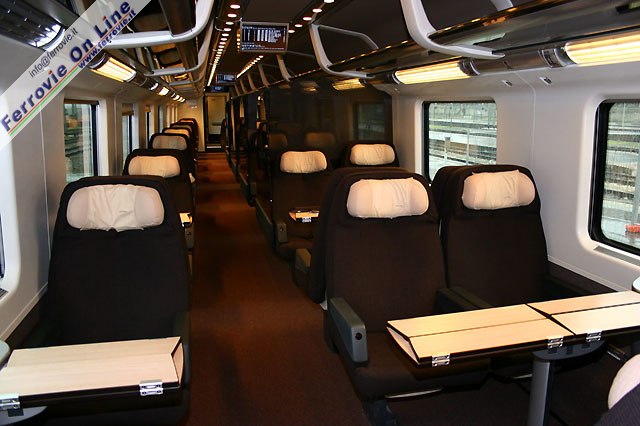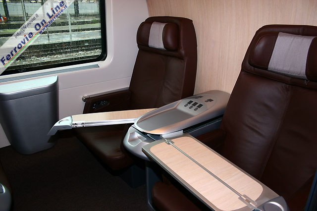 Sono in prima classe ed i nuovi colori su toni di marrone conferiscono all'ambiente un tono elegante e caldo al tempo stesso, come per la seconda classe. Le poltrone sono rimaste le stesse di prima della trasformazione, rivestite però di una nuova stoffa marrone con poggiatesta crema e dotate dei soliti comandi per la reclinazione dello schienale e per l'audio diffusione: peccato che non ho con me un paio di cuffiette, perché mi sarebbe piaciuto verificare se il servizio fosse efficiente, dopo tanti anni di cattivo o mancato funzionamento...