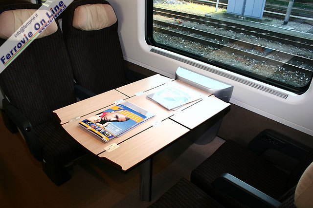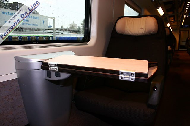 Finalmente ci sono dei nuovi tavolini rivestiti in color legno, apribili a libro e senza l'inutile "gobba" di divisione mangia-posto, sorretti da una nuova struttura color grigio fissata sotto il finestrino che integra, sotto il coperchio incernierato, un capiente cestino doppio. Questa soluzione, oltre che alleggerire visivamente il tutto, lascia soprattutto molto più spazio alle ginocchia dei passeggeri, risolvendo uno dei difetti maggiori quanto a confort dell'ETR.500 tradizionale.