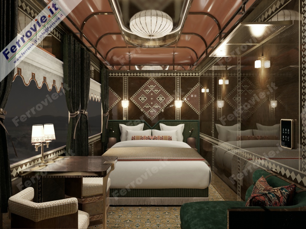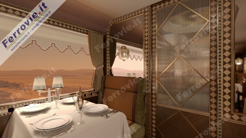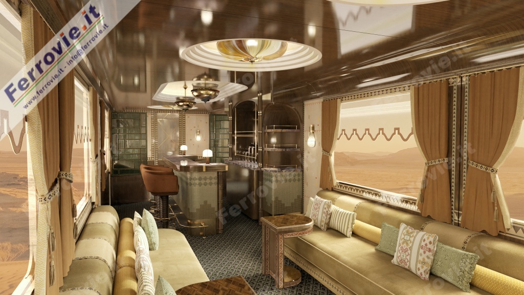 Gli interni riflettono il fascino del deserto arabico, con tonalità sabbiose, texture scolpite e materiali pregiati che celebrano l'artigianato locale. Gli spazi evocano storie antiche reinterpretate in chiave moderna, sottolineando l'eccellenza del design e la maestria dell'alta artigianalità. Attraverso un sapiente equilibrio tra storia e innovazione, il progetto celebra il valore senza tempo dell'artigianalità, rendendo ogni momento a bordo un'opera d'arte. L'esperienza a bordo comprende le sale del lounge bar e del ristorante che si ispirano agli ambienti tradizionali del majlis, con eleganti dettagli in legno intagliato a mano e motivi geometrici che incarnano il calore e l'ospitalità saudita. Il menu, frutto della collaborazione con chef di fama internazionale e locale, offre una proposta gastronomica esclusiva che unisce tradizione e innovazione. Inoltre, opere d'arte e fotografie a bordo celebrano il patrimonio naturale e storico dell'Arabia Saudita, rendendo il viaggio un'immersione culturale unica.