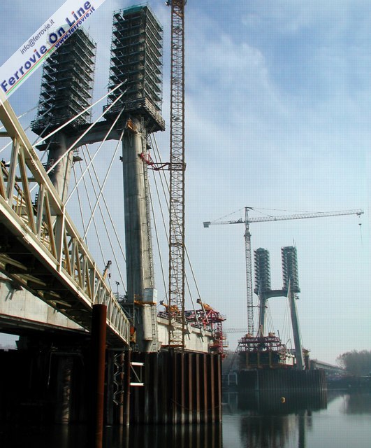 La linea ad alta velocità Milano-Bologna presenta poche opere di grande rilevanza economica e paesaggistica. Una di queste è certamente l'attraversamento del Po che si sta realizzando poche centinaia di metri a valle di Piacenza mediante un ponte strallato il cui progetto si deve al Prof. Ing. Mario Paolo Petrangeli. Nella foto la torre sud e la prima porzione di impalcato fin qui realizzata, sorretta da sedici stralli. (Foto Pietro de' Castiglioni, novembre 2005)