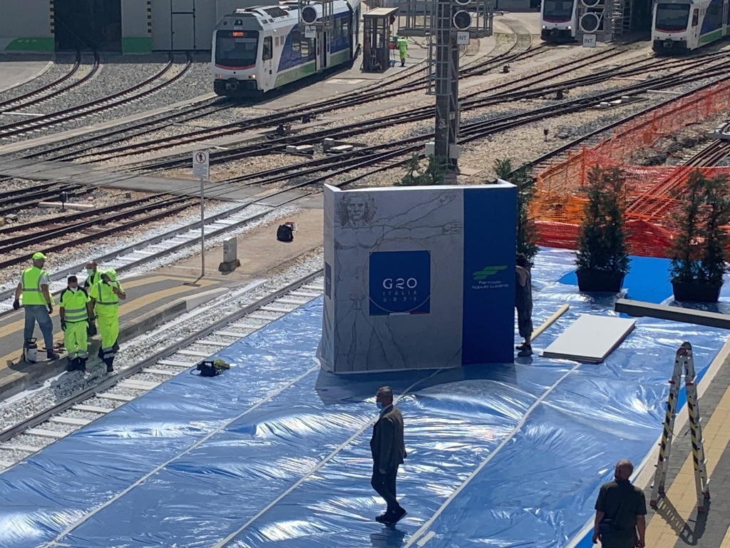 Tra imponenti misure di sicurezza e costanti sopralluoghi delle forze dell'ordine, si stende la moquette azzurra nella stazione di Bari scalo per accogliere e accompagnare i 'grandi' a bordo del treno Stadler che per l'occasione è stato brandizzato con i loghi del G20 sia all'esterno, sui finestrini, sia all'interno, sui copritesta dei sedili. Nel corso del viaggio (una corsa diretta che durerà circa 1 ora e 10 minuti) FAL offrirà ai delegati un piccolo rinfresco preparato per l'occasione dall'Azienda 'Casolare di Puglia' di Triggiano. Biscottini alla pasta di mandorle di Ceglie messapica, taralli tipici baresi de L'Oro di Puglia, ciliegie ferrovia di Orchidea Frutta di Rutigliano, innaffiati da caffè e the, saranno serviti rigorosamente in confezioni monoporzione, come richiedono le norme anti-Covid.