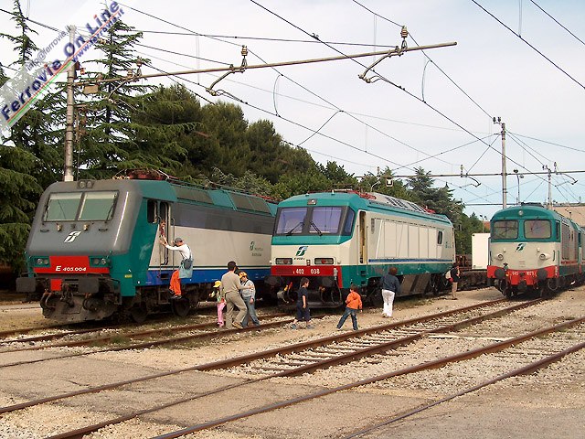 8. Parata di locomotive moderne, esposte a Rimini fianco a fianco con le locomotive storiche: da sinistra a destra, E.405.004 (protagonista delle corsette per il pubblico insieme ad altre macchine), E.402.038, D.445.1023 e 1033 (in seconda posizione). (Foto Jacopo Fioravanti, 4 giugno 2006)