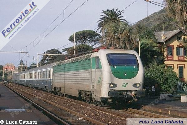 Dopo aver fatto alcuni scatti mi potevo considerare più che soddisfatto della mia "caccia alle 321", anche se ancora non l'avevo vista muoversi; decisi così di andare a fare qualche foto a Genova Nervi, per ritrarre le moderne E.402B in testa agli IC da e per Roma. Poco dopo il mio arrivo, in una particolare atmosfera che avvolgeva la stazione, dovuta all'imponente mareggiata che arrivava a bagnare addirittura i binari, transitava la E.402.110, stranamente priva del vomere con la marcatura, probabilmente per un urto.