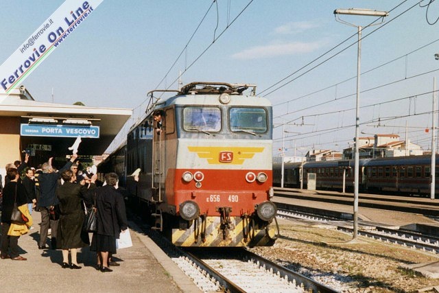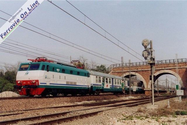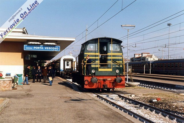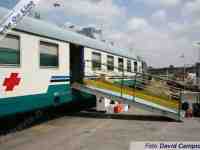 Quest'anno il pellegrinaggio è stato organizzato dalla Diocesi di Vigevano, fra il 7 ed il 13 maggio. Io sono assegnato al "treno azzurro", nome assai evocativo per noi ferroamatori, che è composto da 11 cuccette e due bagagliai. Alle prime cinque cuccette destinate al trasporto dei malati, e pertanto impropriamente definite "ambulanze", fanno seguito i due bagagliai, uno adibito a cucina e segreteria, l'altro a deposito carrozzine e cappella, ed infine le rimanenti cuccette per i pellegrini ordinari. Di fatto la maggior parte dei barellieri e delle dame sono nelle prime cinque carrozze, per dare assistenza ai malati, mentre nelle ultime sei vetture la presenza del personale OFTAL è ridotta al minimo, avendo come compito la sola distribuzione del cibo e la pulizia delle carrozze. Il mio compito in questa fase è il "trasporto bagagli", così che al mio arrivo in stazione a Vigevano ho poco tempo da dedicare all'esame delle due locomotive, due "caimani", posizionate in testa al treno.