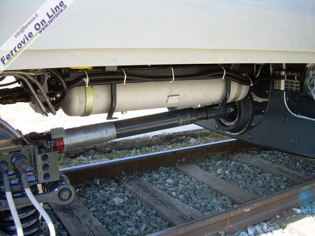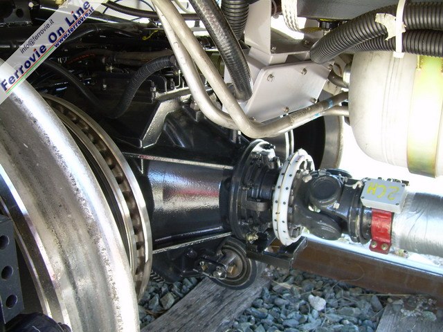 L'albero di trasmissione del nuovo Pendolino: a destra il sottocassa che ospita il motore ed a sinistra il carrello anteriore dell'elettrotreno. (Foto Maurizio Tolini, 5 giugno 2006)