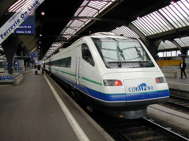 Cisalpino ha iniziato l'attività il 29 settembre 1996, con due coppie di treni tra Milano e Ginevra ed una tra il capoluogo lombardo e Basilea. Da allora il servizio è garantito dagli ETR.470 della società italo-svizzera, il Pendolino politensione derivato dagli ETR.460 delle FS. Nella foto l'ETR.470 treno 1, appena giunto nella stazione di Zurich HB da Milano. (Foto David Campione, 2 ottobre 2002)