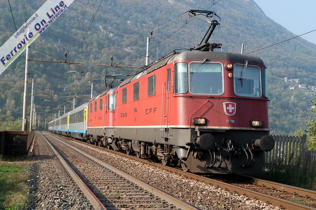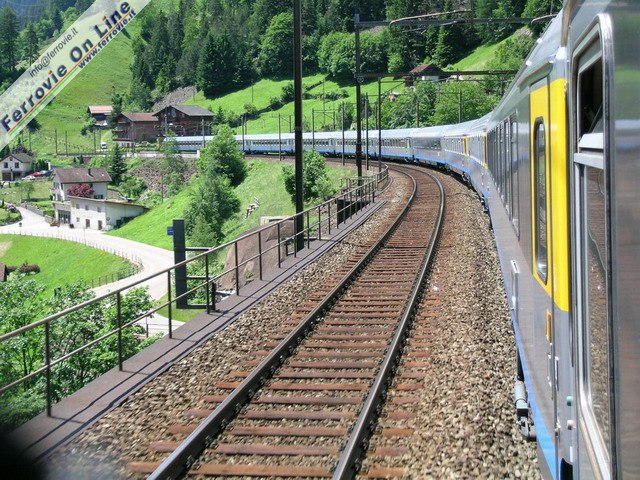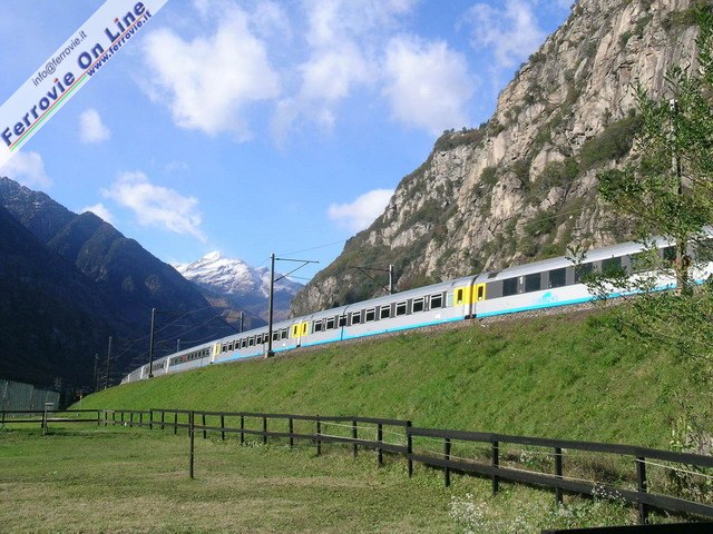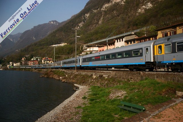 Dal giugno 2004 ai collegamenti effettuati con i nove ETR.470 della flotta Cisalpino, si sono aggiunti quelli effettuati con materiale ordinario in livrea Cisalpino. Si è debuttato con due coppie Eurocity Cisalpino: il "Canaletto" Venezia - Zurigo e vv. nonché il "Cinque Terre" La Spezia - Zurigo e vv. qui ripreso in viaggio verso la cittadina ligure, sul tortuoso tracciato del San Gottardo. (Foto David Campione, 14 giugno 2004)