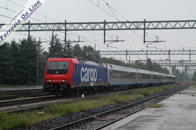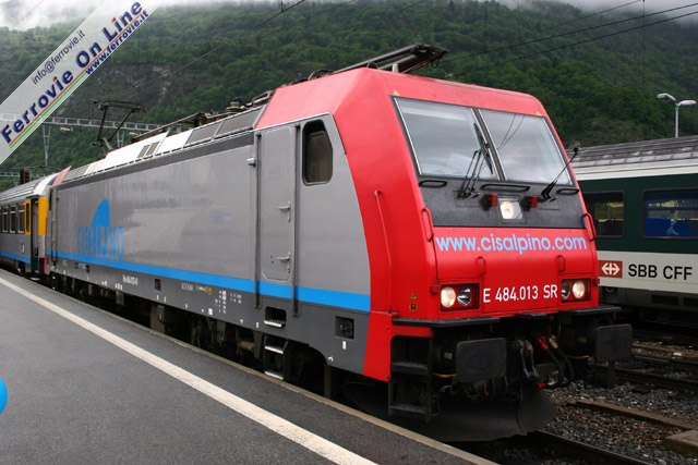 Lunedì 12 settembre 2005 debuttano in testa agli Eurocity Cisalpino le locomotive politensione E.484 di SBB che conducono il convoglio per l'intero tragitto, senza cambio di trazione nelle stazione di confine quali Domodossola e Chiasso con notevole guadagno di tempo. L'esordio avviene con gli EC CIS 132 e 135 "Borromeo", Milano - Basilea e viceversa. Nell'immagine il primo viaggio dell'EC CIS 132 verso Basilea con la E.484.017 ancora in livrea "Cargo", succesivamente sostituita. (Foto Tg-trains.com, 12 settembre 2005)