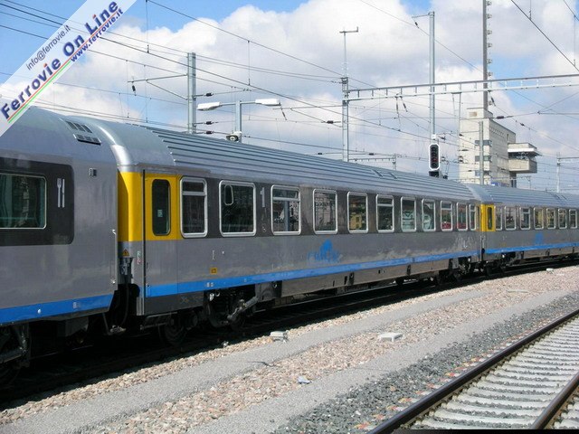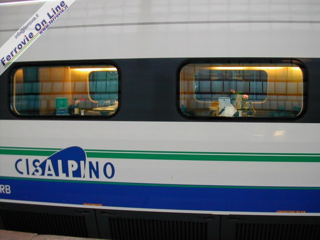 5 vetture ristorante di Trenitalia sono state rinnovate ed adeguate alle esigenze di Cisalpino, che dal 2004 le ha introdotte negli EC "Cinque Terre" e "Canaletto". Quest ultimo è ripreso in corsa verso Zurigo a Capolago. (Foto David Campione, 4 aprile 2005)