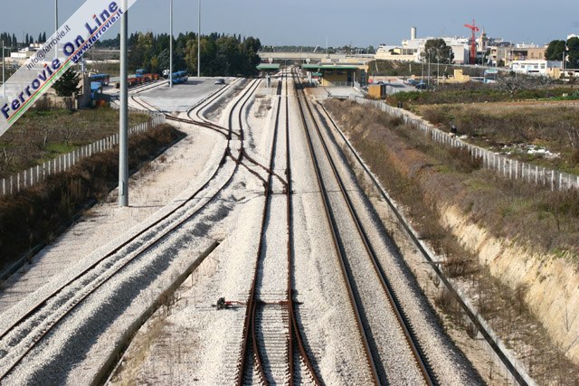 Panoramica del nuovo impianto di Noicattaro, attualmente classificato come fermata seppur presenziato. Il raddoppio che ha origine da qui non è al momento operativo, i deviatoi di stazione sono tutti immobilizzati e comunque a comando manuale. L'unico binario in servizio è il dispari, a destra nella foto. A sinistra l'asta di manovra al servizio dell'ampio scalo merci, attualmente adibito al parcheggio di autobus delle FSE in disuso. (Foto David Campione, 27 dicembre 2006)