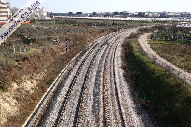 Partiranno a gennaio i lavori per rendere operativo il raddoppio Noicattaro - Rutigliano, con la messa in opera dei segnali e degli impianti ACEI necessari per la circolazione. Nell'immagine l'ampio curvone in uscita da Noicattaro, con a sinistra il binario già in esercizio. Qui termina la breve variante di tracciato: a sinistra si riconosce il sedime su cui correva il semplice binario a servizio della vecchia stazione. (Foto David Campione, 27 dicembre 2006)