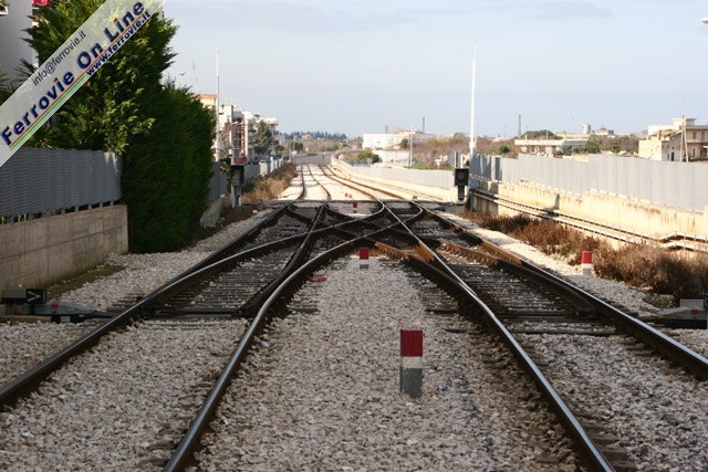 Nel comune di Rutigliano il raddoppio della sede ferroviaria ha comportato l'adeguamento di due Passaggi a Livello in prossimità della stazione nonché l'adeguamento del piano binari lato Noicattaro. Nella foto una doppia comunicazione tra i due menzionati PL; sullo sfondo si riconosce la linea ferrata che discende per sottopassare la provinciale Noicattaro - Rutigliano, sostituendo un Passaggio a livello. (Foto David Campione, 27 dicembre 2006)