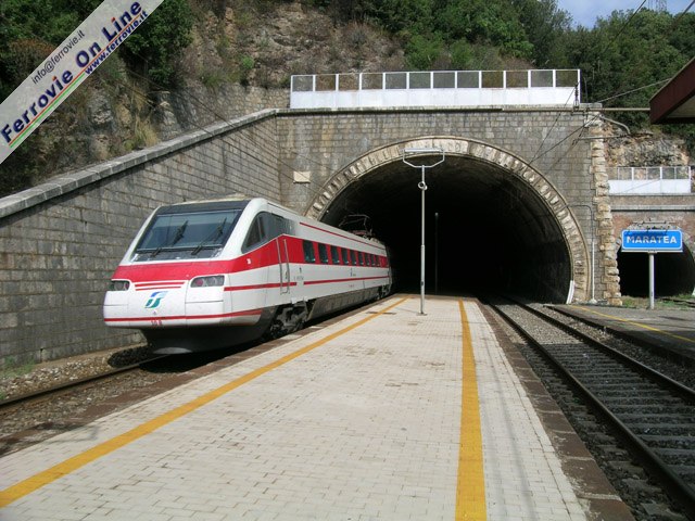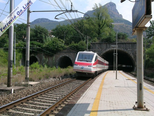 ETR.480 in corsa verso Reggio Calabria. In primo piano la galleria principale con i due binari di corretto tracciato, nel mezzo la galleria del 1° binario ed a sinistra la galleria ormai abbandonata del tracciato storico della ferrovia tirrenica, quando il tracciato era a semplice binario. Il tutto è dominato dal monte San Biagio su cui si erge la statua del Cristo Redentore, che con i suoi 22,10 metri di altezza è la seconda al mondo dopo quella di Rio de Janeiro. (Foto David Campione, 6 settembre 2004)