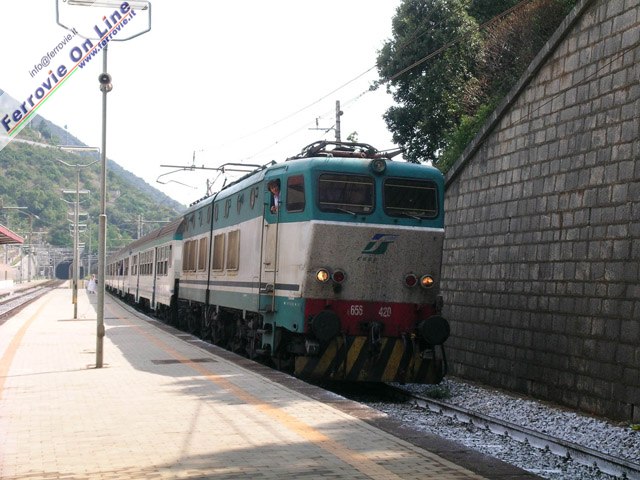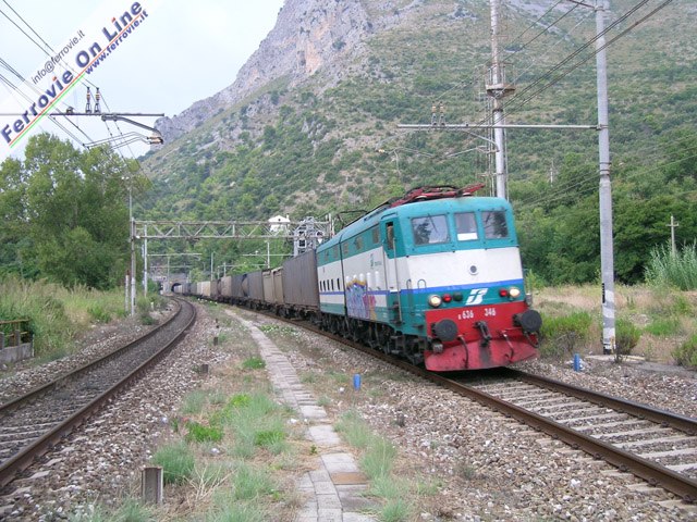 L'anziana E.636.346 fa il suo ingresso a Maratea con un lungo treno merci, proveniente da nord. (Foto David Campione, 6 settembre 2004)
