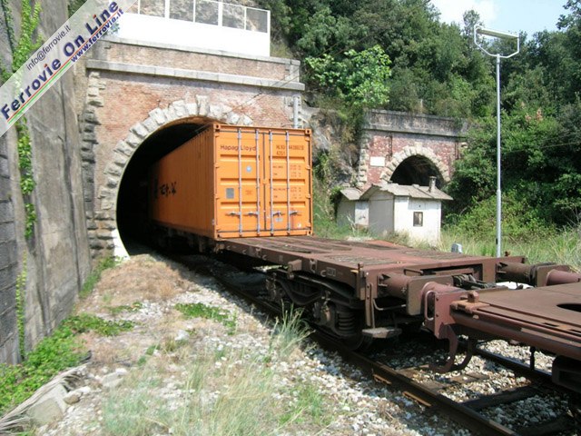 In caso di precedenze, l'unico binario disponibile a Maratea è il 1°, raggiungibile lato nord da una galleria indipendente. Nell'immagine un merci con casse mobili diretto a sud, impegna il binario di precedenza per cedere il passo ad un treno più veloce che transiterà nella vicina galleria a doppio binario. (Foto David Campione, 12 agosto 2003)