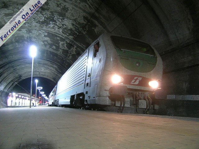 Un Intercity Notte per Milano sosta a Maratea per servizio viaggiatori. La lunghezza del convoglio ha imposto l'arresto del convoglio nella galleria in curva, rendendo complicata l'opera al Capotreno che dovrà trasmettere il "pronti" ai macchinisti. (Foto David Campione, 5 settembre 2004)