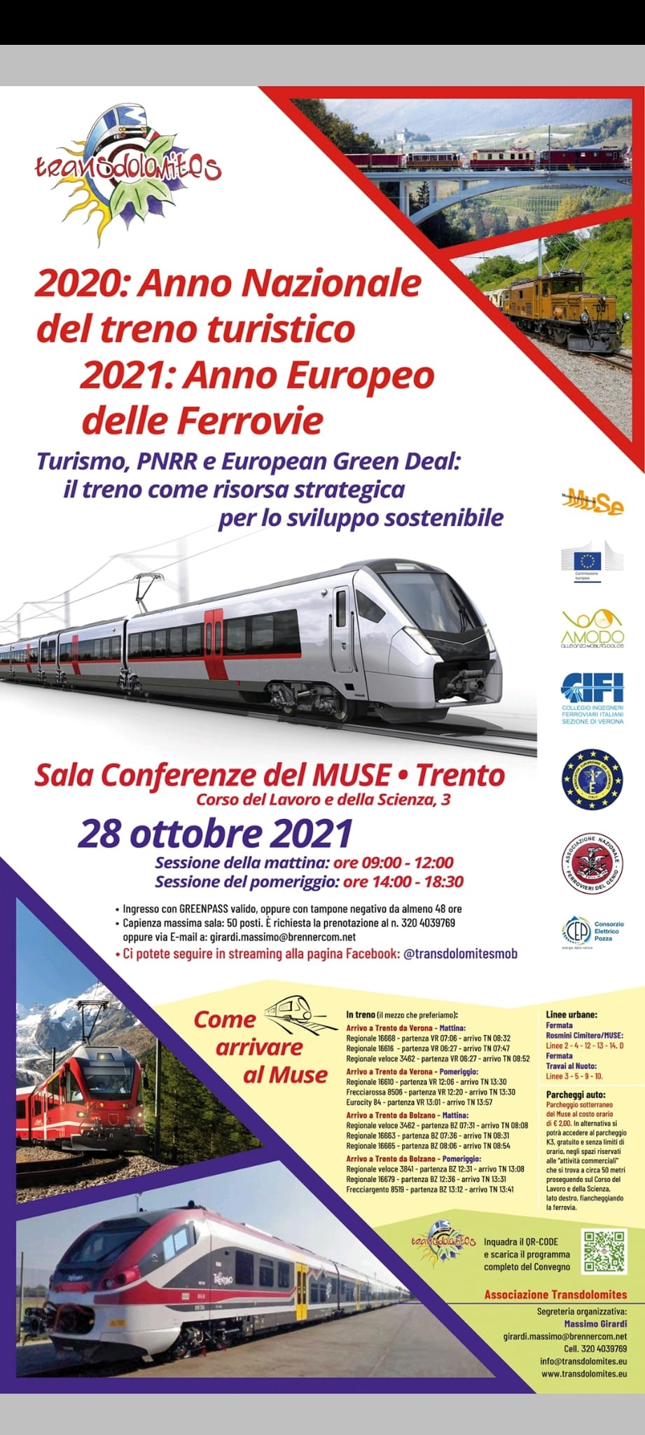 TransDolomites ha il piacere di comunicare e invitare a partecipare al convegno "2020: Anno Nazionale del Treno Turistico. 2021: Anno Europeo delle Ferrovie. Turismo, PNRR e European Green Deal: Il treno come risorsa strategica per lo sviluppo sostenibile", che si svolgerà nella Sala Conferenze del MUSE a Trento, giovedì 28 ottobre 2021. Prima sessione: ore 09:00 - 12:00; seconda sessione: ore 14:00 - 18:30.