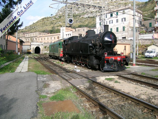 Insolita presenza sui binari di Tivoli: la 940.044 è trainata dalla D.345.1007 verso Roma Tuscolana, dove verrà "carrellata" fino a piazza del Popolo per l'esposizione su un tronchino di binario. (Foto David Campione, 23 novembre 2003)