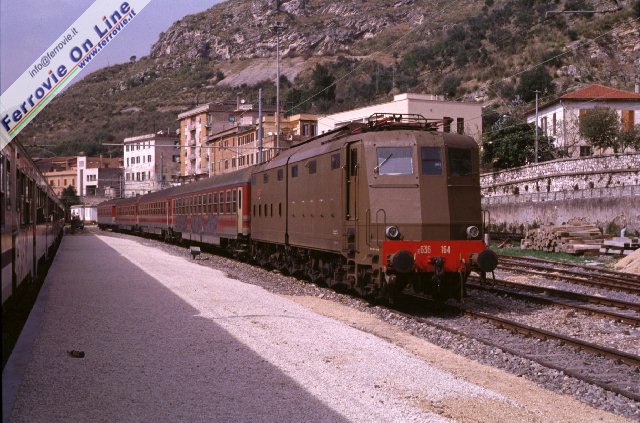 In una scura giornata invernale, una E.646 è pronta a partire verso Roma con una composizione di carrozze per Medie Distanze. (Foto David Campione, gennaio 2001)