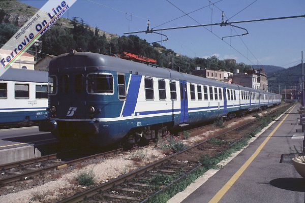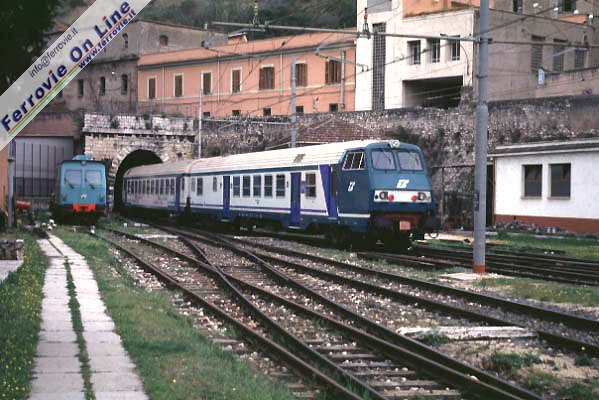 Un complesso di ALe 940 a Tivoli nell'attuale livrea FS, attende l'orario per l'effettuazione di un nuovo servizio verso Roma. (Foto David Campione, maggio 2000)