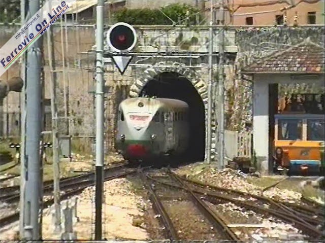 Il treno della foto precedente, ripreso di coda mentre infila la galleria in uscita da Tivoli verso Roma. (Foto David Campione, gennaio 2001)