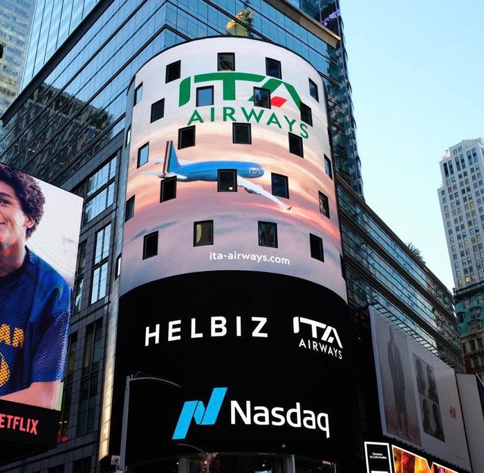 Per dare il via a questa nuova collaborazione e come messaggio di buon augurio, Helbiz e il Nasdaq oggi hanno dato il benvenuto al primo volo della neonata compagnia aerea di bandiera italiana attraverso un messaggio dedicato sullo schermo del Nasdaq a Times Square: "Helbiz and Nasdaq welcome ITA Airways to New York".