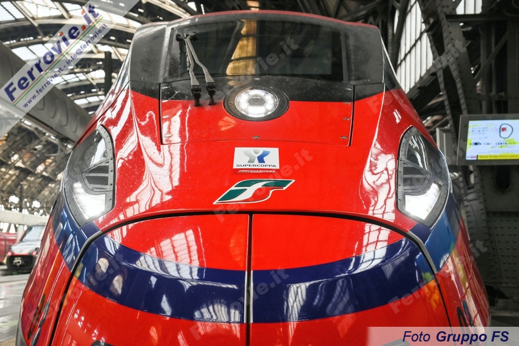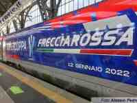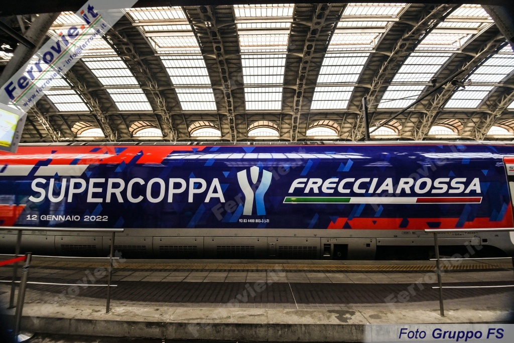 MILANO - Ancora una livrea pubblicitaria per il Frecciarossa 1000 di Trenitalia. In occasione della presentazione dell'orario invernale 2021-2022 del 2 dicembre (vedi Brevi ferroviarie del 02/12/2021), è stato esposto a Milano Centrale l'ETR.1000-03 con la coloritura personalizzata "Supercoppa Frecciarossa".