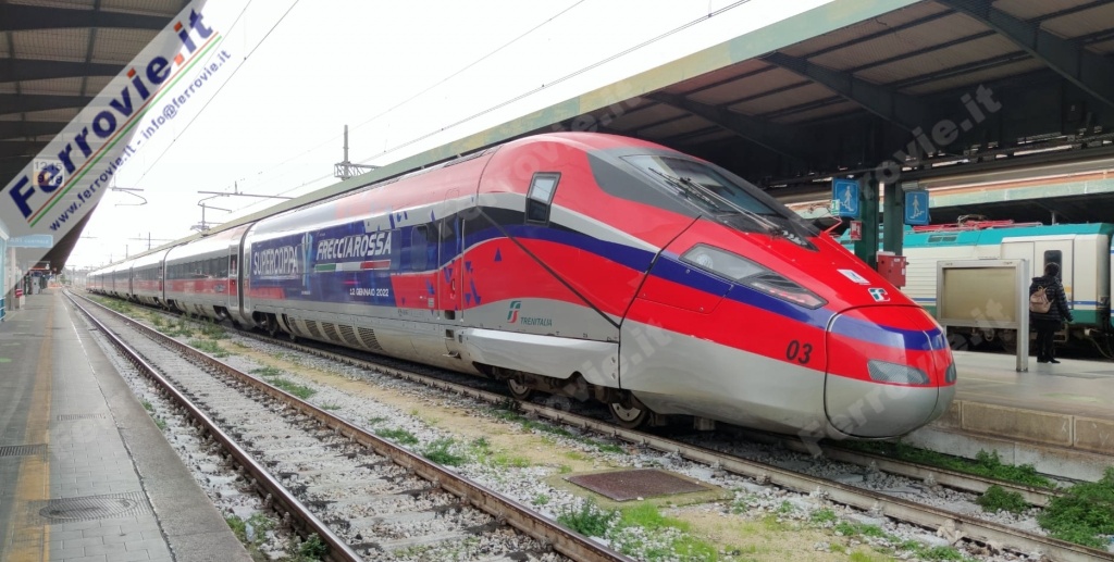 BARI - Questo è l'ETR.1000 n.03, il Frecciarossa di Trenitalia diventato famoso nell'ambiente ferroviario per la sua accattivante livrea "Supercoppa Frecciarossa", che da pochi giorni sponsorizza attraverso tutta Italia l'omonimo torneo calcistico (vedi News ferroviarie del 03/12/2021).