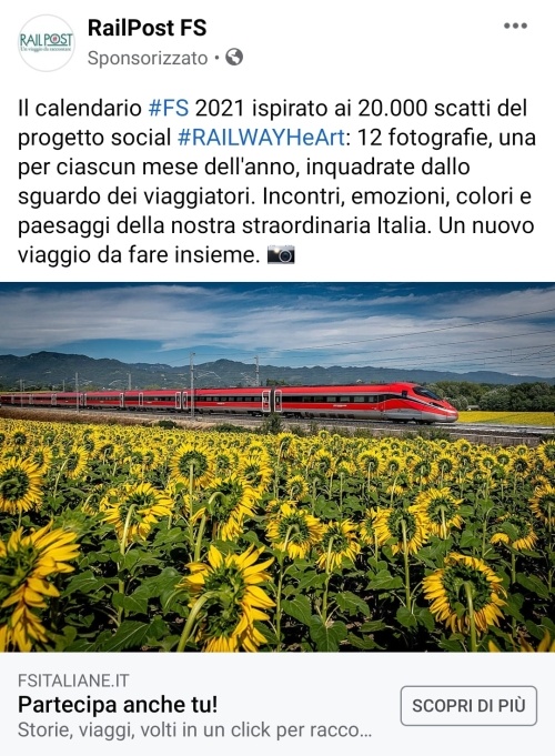 E sempre FS - cosa di cui siamo davvero lieti - festeggia con un ulteriore post "... 30mila scatti pubblicati dai viaggiatori su Instagram con l'hashtag #RailwayHeart. La rubrica, nata 3 anni fa, racconta l'universo ferroviario: partenze, arrivi e treni in corsa, incontri, sorrisi, sguardi e paesaggi immortalati dall'obiettivo di una macchina fotografica..."