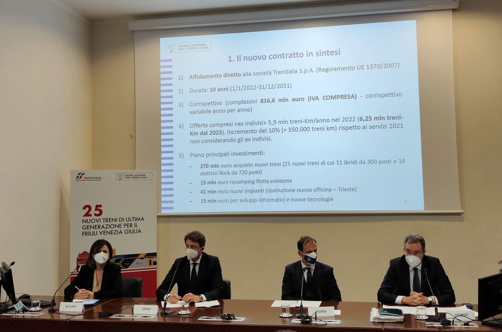 Questi i punti principali del nuovo Contratto di Servizio 2022 - 2031 firmato da Regione FVG e Trenitalia (Gruppo FS Italiane) e illustrato da Massimiliano Fedriga, Presidente della Regione, e Luigi Corradi, Amministratore Delegato e Direttore Generale di Trenitalia.