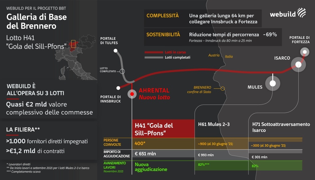 È partito a metà gennaio 2022 il progetto di costruzione del Lotto costruttivo "H41 Gola del Sill-Pfons" della Galleria di Base del Brennero. Il contratto del valore complessivo di €651 milioni è stato aggiudicato a Webuild, in raggruppamento di imprese, lo scorso novembre e porterà all'impiego di 400 lavoratori diretti. Un nuovo grande progetto in Austria, Paese che rientra nelle strategie di sviluppo commerciale in mercati a basso rischio con interessanti piani di sviluppo infrastrutturale, che Webuild sta perseguendo con determinazione già da qualche anno.