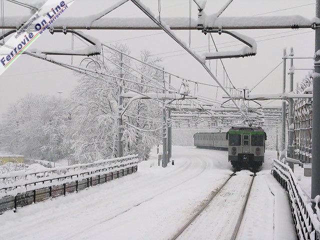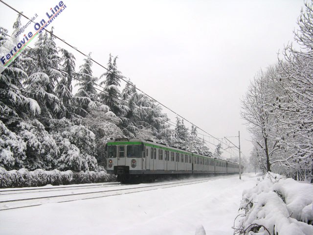 Dopo una pausa pomeridiana, nella notte fra il 6 ed il 7 gennaio la neve ricomincia a cadere molto fitta ed asciutta e continua poi per tutta la mattinata. In auto si circola a passo d'uomo e con difficoltà. Per andare a Milano da Cernusco sul Naviglio decido di usare la M2 che circola abbastanza regolarmente. L'immagine riprende un convoglio in partenza da Cascina Gobba per Gessate (Foto Guido Catasta, 07 gennaio 2009)